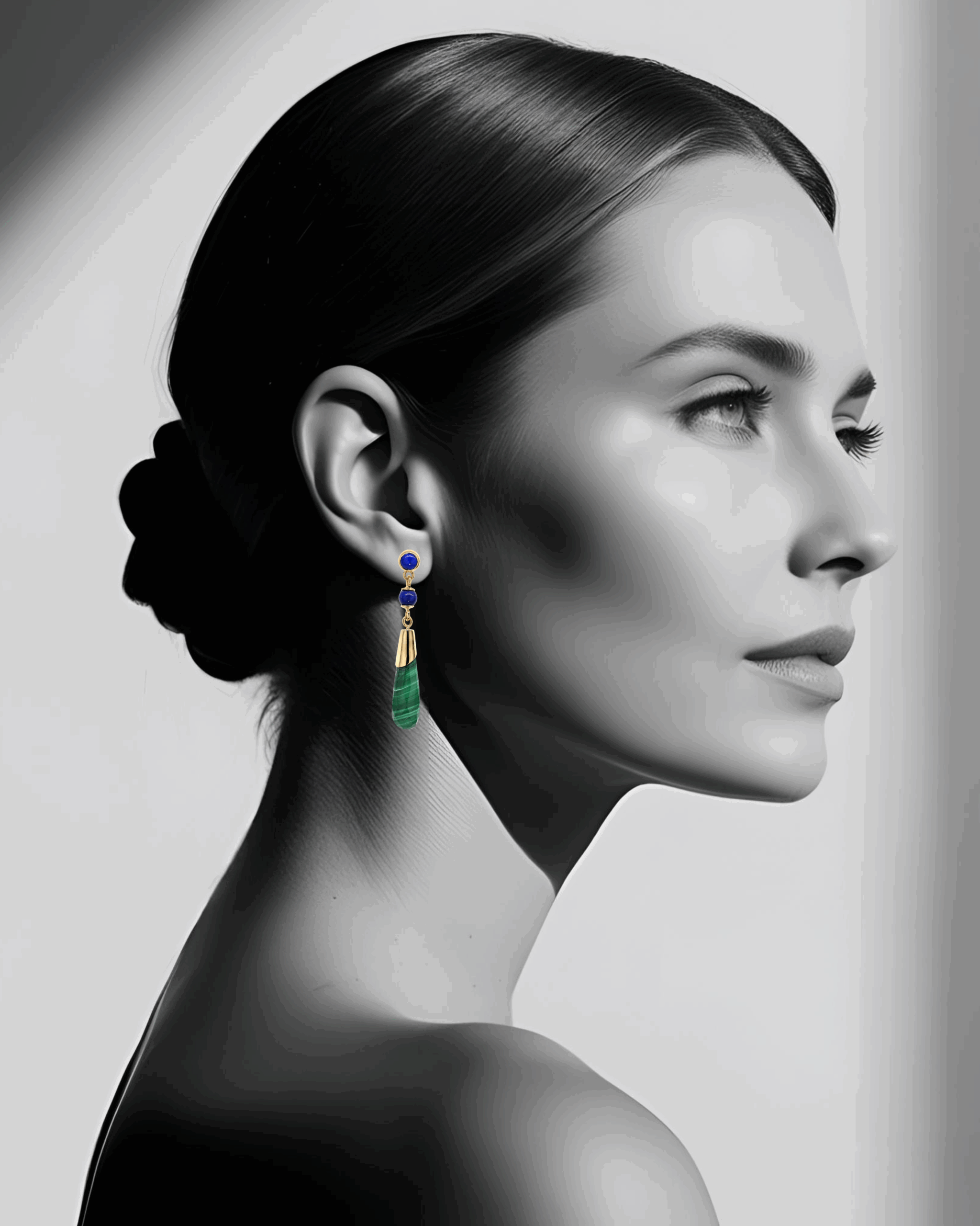 Sculptées dans l’élan de la modernité, les boucles Mirae allient la profondeur du lapis-lazuli à la force végétale de la malachite.